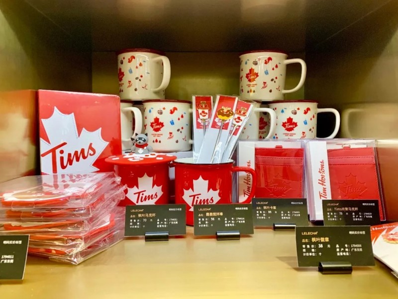 楽楽茶咖啡还与年初刚在上海开了全国首店的加拿大国民咖啡Tim Hortons合作推出了天乐雪,我们在店内还看到了Tim Hortons的马克杯,枫叶的logo很有代表性。