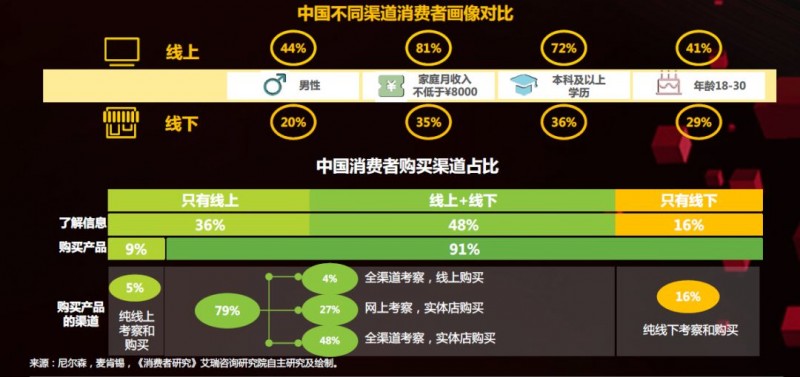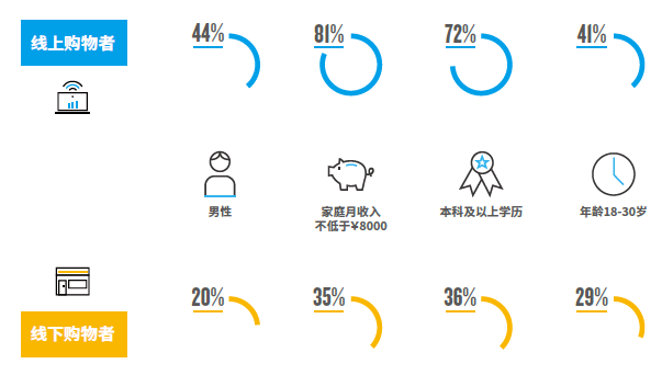 还有一个更重要数据是家庭月收入,线上的购物者比线下的购物者收入高的占比高出46%。不仅收入高的居多,学历高的也比线下高出许多,其次是更加年轻化。