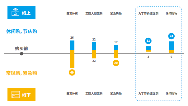 尼尔森最近的研究指出,大部分消费者偏好在实体渠道进行“日常补货”或“紧急购物”;而线上渠道最受欢迎的情况,是当消费者在“休闲购物”或商家在“特定节日推出特价或促销”时选择上线。