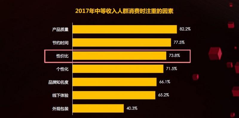 《2018中国零售商超全渠道融合发展年度报告》的数据显示,中国中等收入人群消费时除关注产品质量及时间外,有73.8%的消费者在消费时更关注商品的性价比。