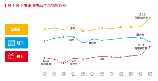 根据尼尔森的零售核数和线上零售监测数据,可以观察到去年元旦假期与“双十一”购物节伴随着的快消品销售增长,也带动了全渠道的增长。