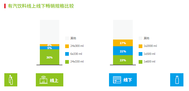 特别有意思的是尼尔森的报告有一页对有汽饮料的包装规格对线上线下消费的影响做了研究,并给出了一个建议:为线上与线下渠道设计出不同的包装规格,细微的促销战略,可以带动整体销量的增长。