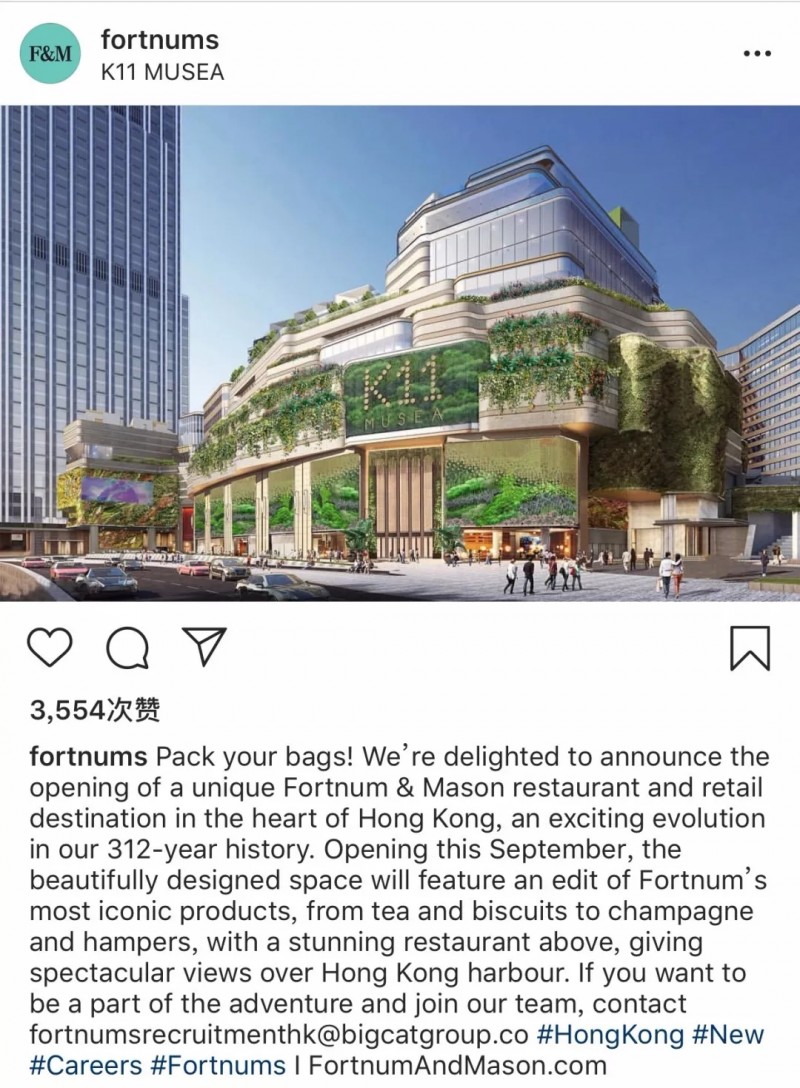 4月3日,Fortnum&Mason官方ins宣布今年9月将进驻香港即将开业的K11 MUSEA,这是一家零售店+餐厅的两层旗舰店,占地约650平米,空间设计精美,具有Fortnums的主要特色。