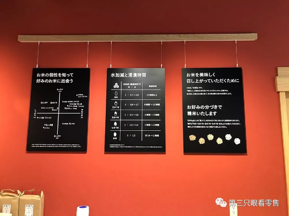 大米的现场加工成为AKOMEYA最具体验性的部分,AKOMEYA将它设置在门店最里面的角落,形成一个磁石点,带动周边的包装食品销售。为了增强体验,AKOMEYA在大米加工的区域制作一个玻璃橱窗,来展示不同成分以及不同品种的大米。