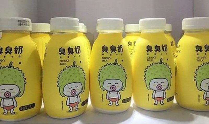 今年年初,“土味”的李子园终于开窍,试验性地推出了一款名为“臭臭奶”的饮品,顾名思义,其实就是一款榴莲风味的牛奶产品。与李子园经典的甜牛奶的包装风格迥然不同,臭臭奶以鲜艳的鹅黄为底色,配上蠢萌的卡通人物,显然更加迎合年轻人的喜好。