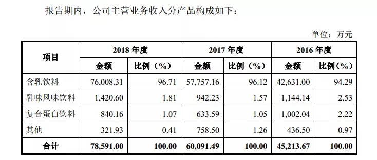 2016至2018年,李子园含乳饮料的销售收入分别为4.26亿、5.78亿和7.60亿,分别占公司主营业务收入的94.29%、96.12%和96.71%,为公司的核心收入及利润来源,年均复合增长率达到33.53%。