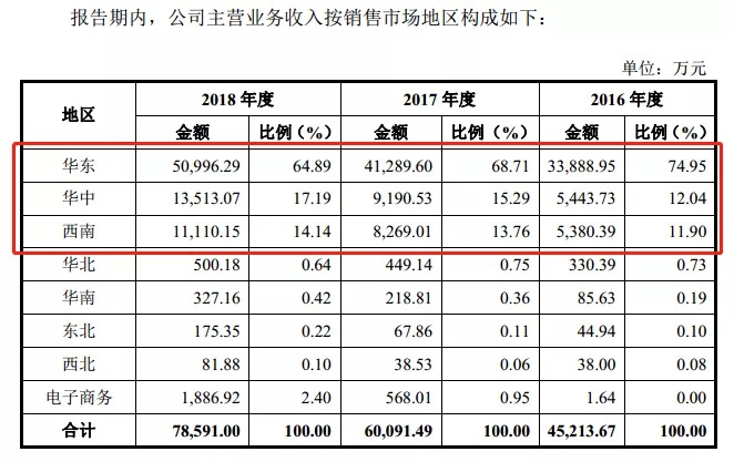 同时,李子园还存在销售区域过于集中的问题。从上表可以看出,公司在华东区域的含乳饮料销售额要显著高于其他区域,比例维持在70%上下,华中和西南区域紧随其后。