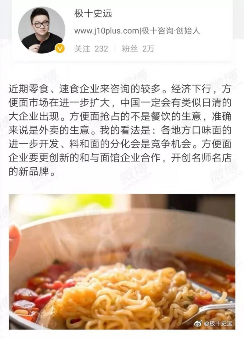 一款中国非油炸方便面在方便面大国爆红,传达了怎样的市场信号?近期极十咨询创始人也在微博上发表了对于方便面市场的看法。
