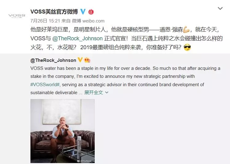 他还与全球诸多顶级品牌合作,如今又与风靡全球的高端水VOSS建立了战略合作关系,VOSS风靡全球近百个国家,凭借纯净、卓越、责任、品质的特色铸就了高端品牌内核,深受皇室贵族、政商大佬,好莱坞巨星等高端人群及社会精英人群的青睐,在高端水市场更拥有无可比拟的能量,正向制片人、投资商角色过度的强森,自然不会错过良机,运用自己的全球影响力与VOSS一道再攀高峰。