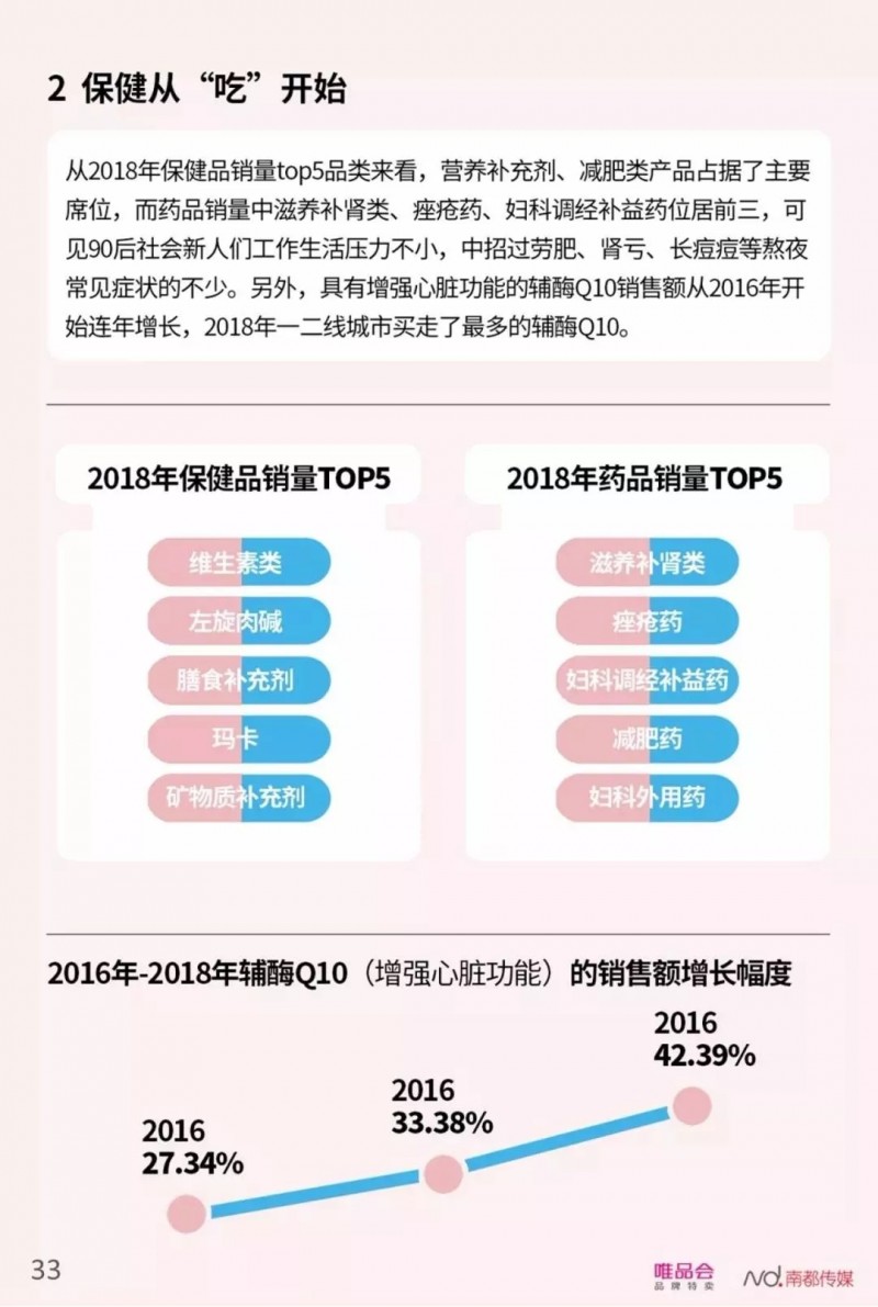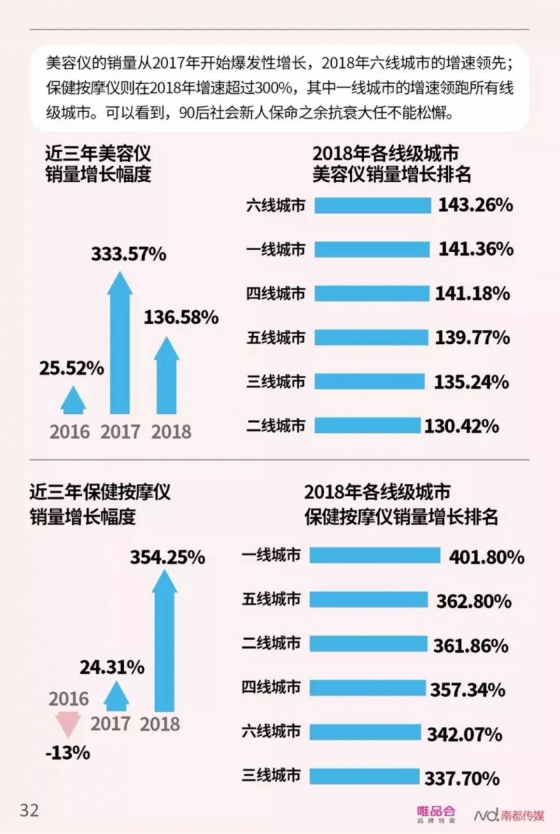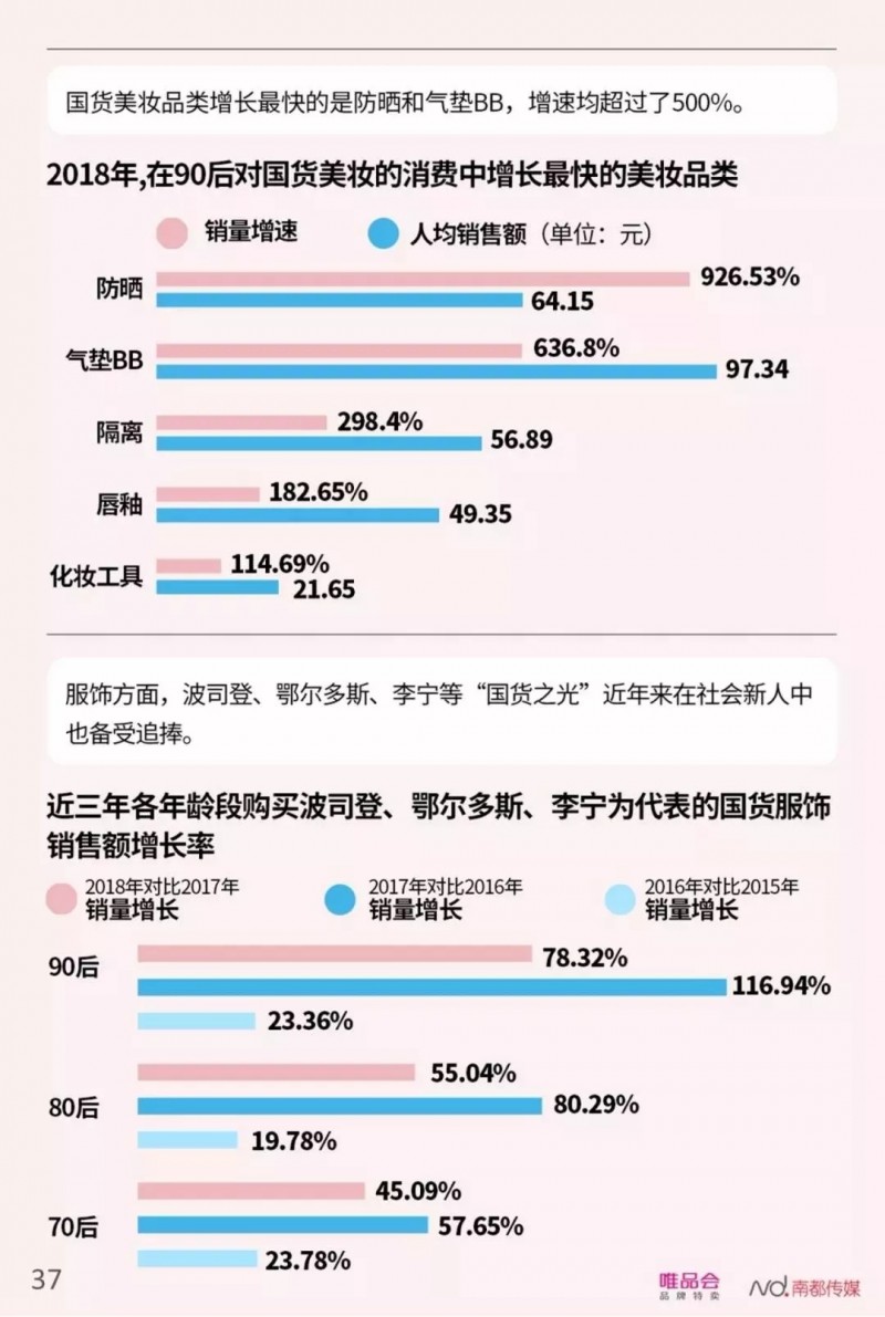 更能彰显90后社会新人“先锋个性”的消费活动主要集中在三个方面,颜值消费、娱乐消费、国货热。90后是信奉“颜值即正义”的一代,他们之中49.74%都购买眼霜、美容仪等抗衰老产品;保健品、健身体用产品也是90后对抗工作压力、保持良好身材的秘诀,2018年,唯品会平台上保健按摩仪的销量增速超过了300%,健身服、健身器材、运动鞋等体用品在90后用户中的销量则保持着两位数增长。