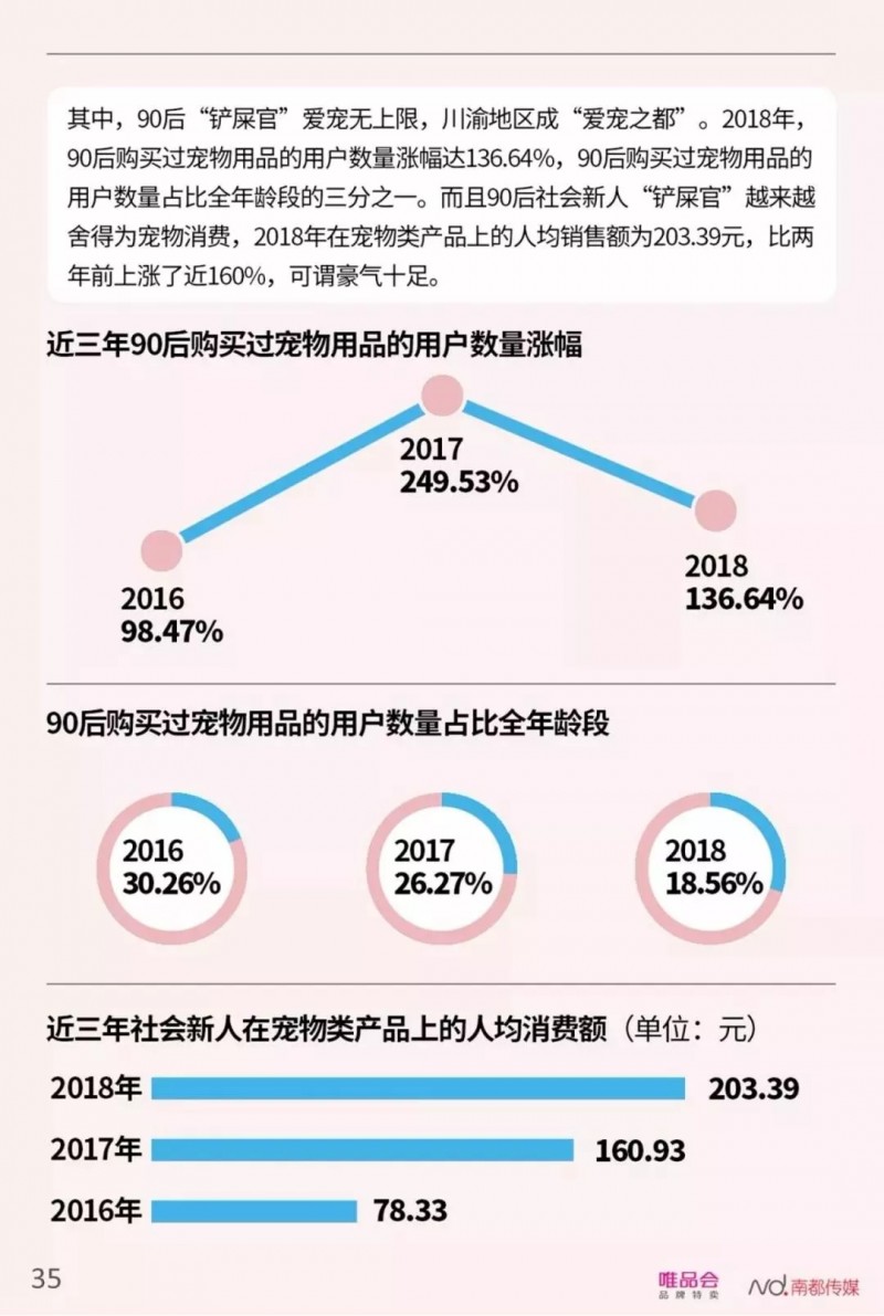 对于重视私人空间的90后社会新人而言,“家”是最重要的消费场景之一。《报告》指出,社会新人爱添置小家电,且偏好“专业且功能集成型”产品,这点在一线城市年轻人中最为明显,2018年唯品会平台上扫地机器人在一线城市社会新人中的销量增速接近166%。家居产品方面,社会新人看重“生活仪式感”,杯碟、花瓶等小物件最受欢迎。另外,宠物消费是社会新人消费支出中最“无上限”的一块,90后特别舍得为宠物花钱,2018年在唯品会平台,90后社会新人对宠物产品的人均消费额比两年前上涨了近160%。