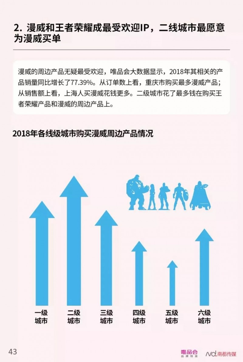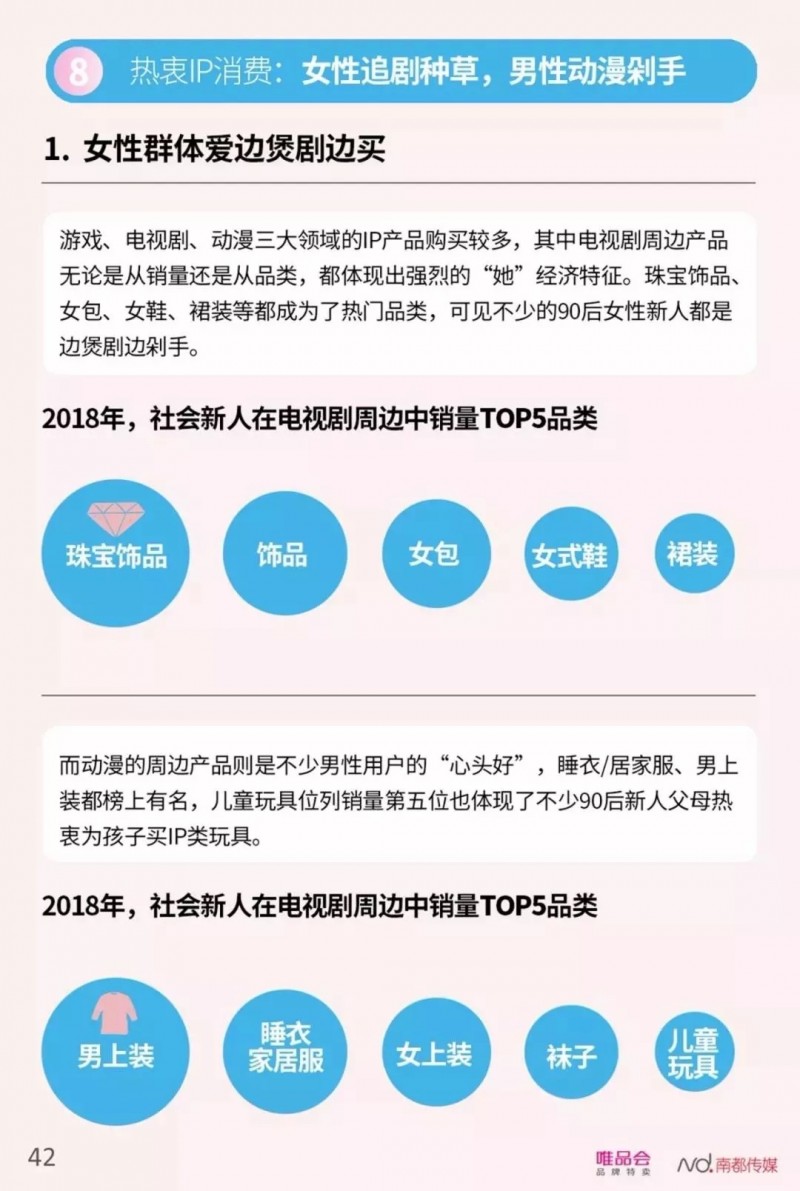 娱乐消费方面,90后的“配置控”和“收集控”表现无遗。一方面,90后社会新人追求“最顶配”的电子娱乐设备,自2016年开始,手机、耳机霸占了90后社会新人电子数码产品销量TOP2;另一方面,他们还追求“最全套”的IP周边,90后女生爱追电视剧同款,90后男生则爱追动漫和游戏周边,唯品会大数据显示,2018年漫威相关周边产品销量增长最快,同比增长77.39%。