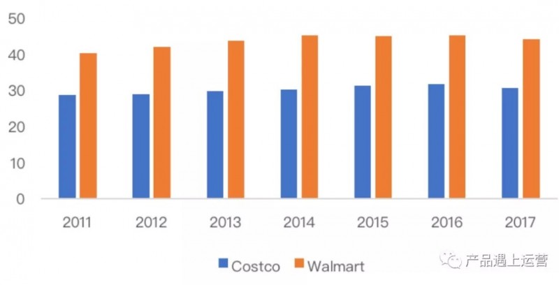 (1)库存周转天数远低于同行。因为商品少,所以销量集中,库存周转快。极低的库存周转率带来了资金运转效率的提升,降低了经营成本。Costco和沃尔玛的库存周转见下图。