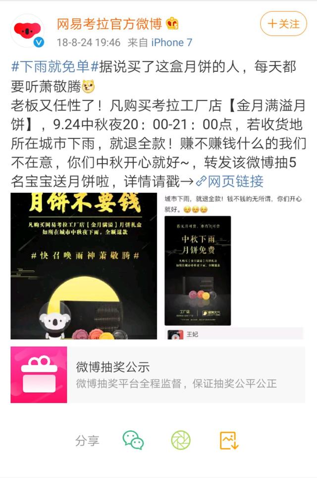 为了卖月饼,他们策划了一场“中秋下雨,月饼免单”的营销活动,顾名思义,就是买了月饼的顾客,如果所在城市中秋节当晚下雨,那么网易考拉将会退款给消费者。