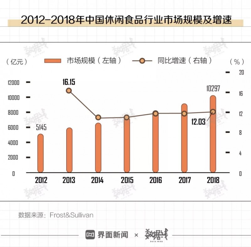 Frost&Sullivan数据显示,2018年中国休闲食品行业市场规模突破1万亿。2018年市场规模同比增速为12.03%,为近五年新高。