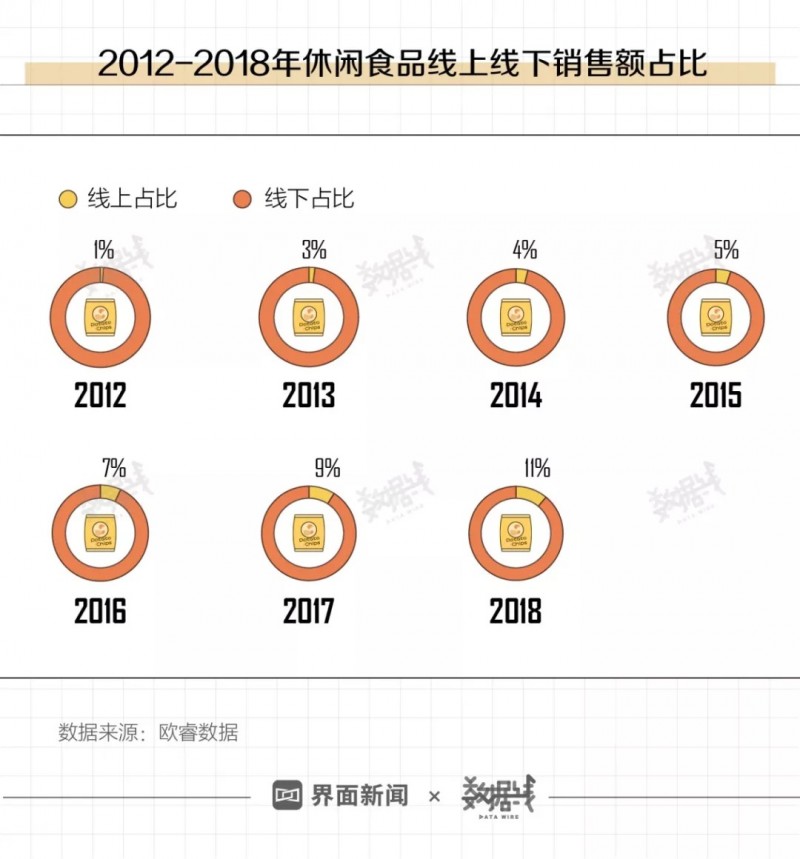 2012到2018年,中国零食电商迅速崛起。根据欧睿数据,2012年休闲食品线上销售额占比仅为1%,2018年线上占比升至11%。