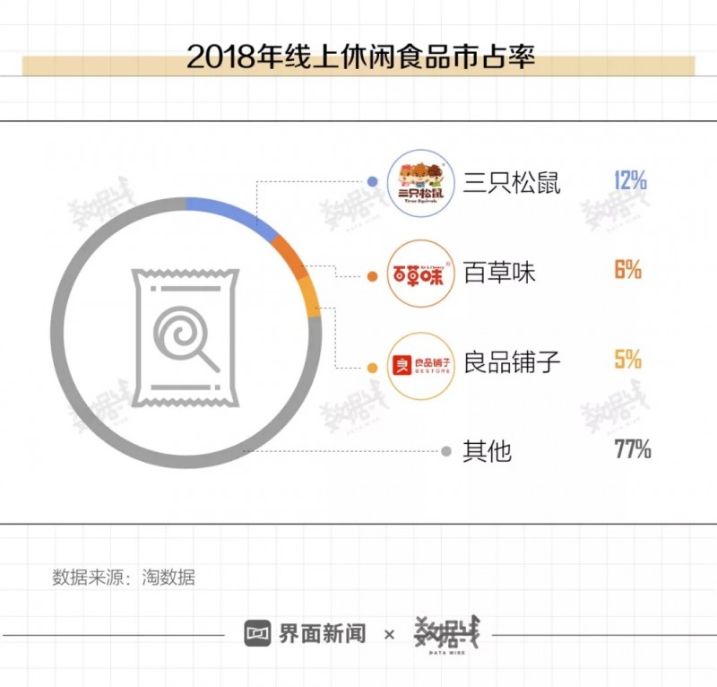 在零食电商中,三只松鼠、百草味和良品铺子分别以12%、6%和5%的市占率领跑线上休闲食品。