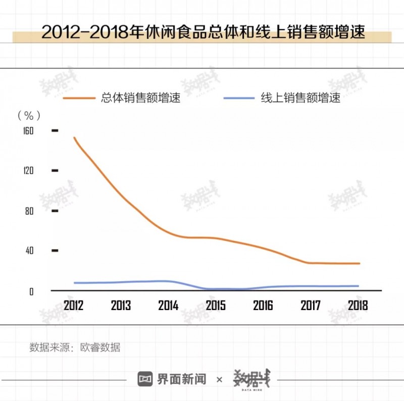 欧睿数据显示,2018年线上休闲食品总体销售额增速已经从2012年的接近160%降至不足40%,线上零食销售额增速步入中速时代。