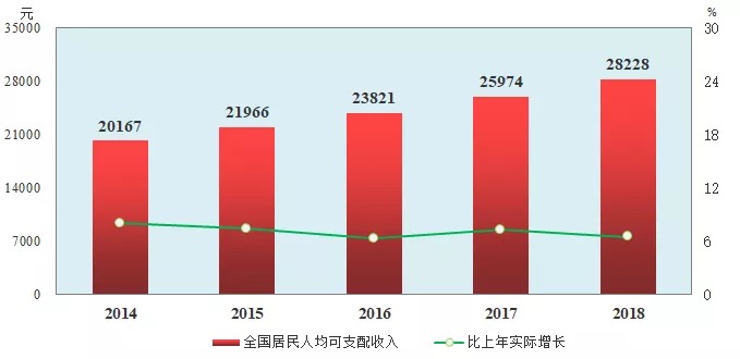 2014-2018年全国居民人均可支配收入及其增长速度(资料来源:国家统计局)