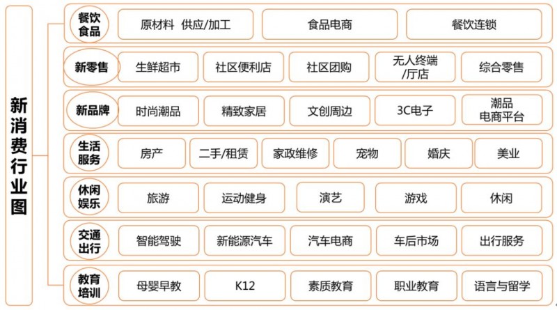 目前进行的消费升级正在驱动着以餐饮食品、新零售、新品牌、生活服务、休闲娱乐、教育培训、交通出行为代表的细分赛道快速发展。此外,新消费也在带动产业实现高技术化、高集约化和高附加值化,有利于增强产品的竞争力,进一步加快产业的发展和转型升级。