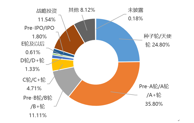 从融资轮次来看,Pre-A/A/A+轮最多,共有996笔,占比35.8%;其次是种子轮/天使轮占比24.8%,由此可见,融资主要集中在早期占比超50%,说明资本更偏向关注早期市场。Pre-B/B/B+轮共有309笔,占比11.11%。C轮、D轮、E轮及以后融资共占比6.65%。