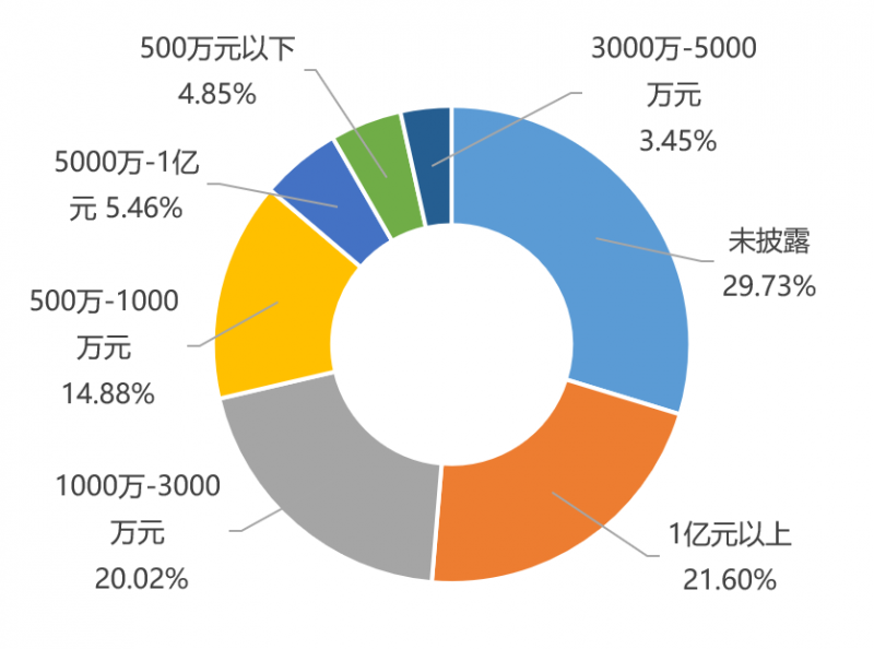 从融资金额来看,在1亿元以上的大额融资事件较多,占比21.60%;其中金额最大的一笔融资来自由高瓴资本,红杉资本中国,招商局资本,腾讯产业共赢基金等多家投资机构共同对京东物流的战略投资,金额达25亿美元。其次是1000万-3000万人民币的融资事件,占比也达到20.02%。未披露融资金额的事件占比最大,达29.73%。