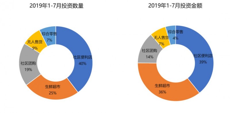 2019年上半年63个获投项目共融资105亿人民币,社区便利店、生鲜超市、社区团购是获投较多的领域。