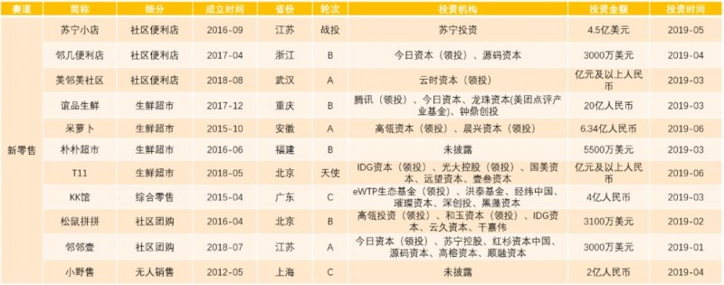 大额投资如“苏宁小店”、“谊品生鲜”等集中在社区便利店和生鲜超市,“邻几便利店”、“呆萝卜”、“朴朴超市”等加速最后一公里社区生鲜布局,“松鼠拼拼”和“邻邻壹”则体现了社区团购运营模式的爆发。