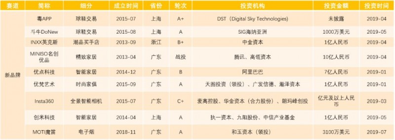 新品牌领域较大投资项目如“MINISO名创优品”、“毒APP”等,以精致家居和球鞋交易为主。小米系“创米科技”和阿里系“优点科技”的智能家居、“Insta360”的智能全景相机、“优梵艺术”的设计感家居,均体现了新品牌在强化设计感、AI科技感,挖掘二手潮品价值方面的探索和追求。