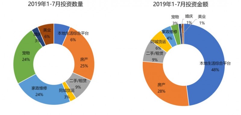 生活服务领域2019年上半年70个获投项目共融资380亿人民币。总体分布看综合平台、房产、二手/租赁、同城货运是获投较多的领域。