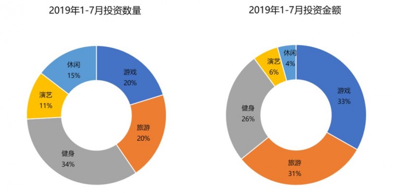 2019年上半年82个获投项目共融资104亿人民币,游戏、旅游、健身是获投较多的领域。