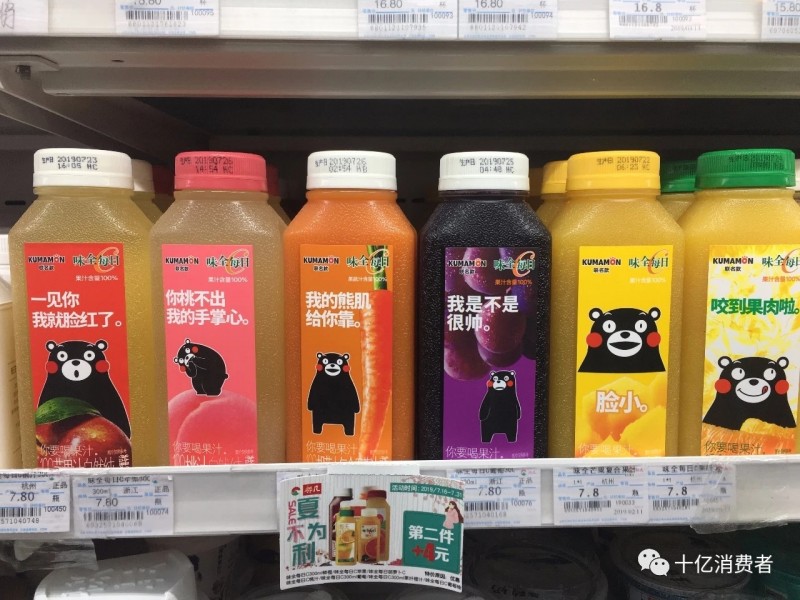 除了新鲜感和颜值,趣味性也很重要。比如下图的饮料。瓶子上的话,没有人会当真,但是很多人看了会不由自主的一笑。