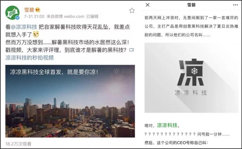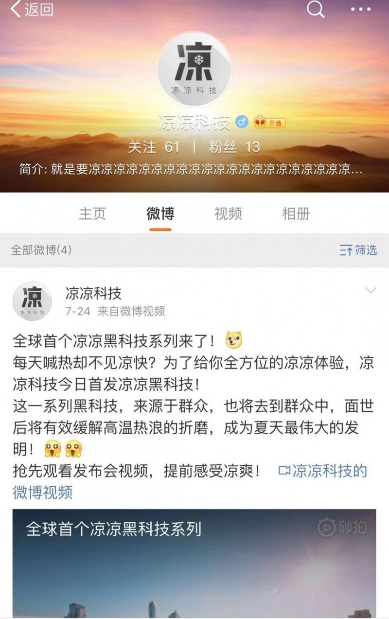 套路一,取个假正经名字。雪碧在前期就造足了势,雪碧先是注册了一个「凉凉科技」的微博,打出了一个「凉凉」的概念。