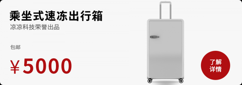 没关系,雪碧还有这款乘坐式速冻出行箱,为你打造头层人造皮革座椅,坐上来自己冻,做自己行走的冰箱。