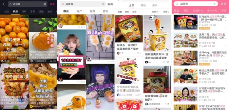 “抖音+快手+小红书+B站”等平台咸蛋黄食品相关视频