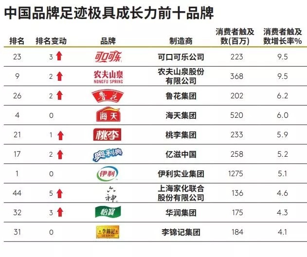 在凯度消费者指数(Kantar Worldpanel)刚刚发布的2019中国品牌足迹报告(2019 Brand Footprint Report)中,已经连续多年被中国品牌占据的增速最快品牌榜上,可口可乐意外成为消费者触及数增长最大的品牌。(2018和2017年增速第一均为农夫山泉,且前十中各只有一个外资品牌:2018年养乐多第6、2017年乐事第10)