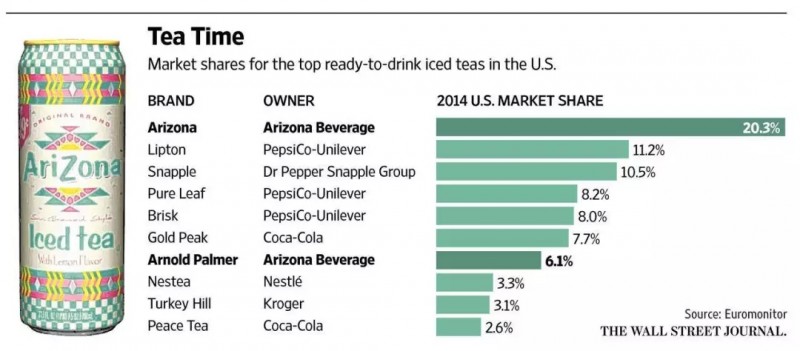 从2000年初开始,亚利桑那冰茶销往美国全境各州,并且市场份额一直稳居前三,有时甚至能比第二名多出接近两倍。
