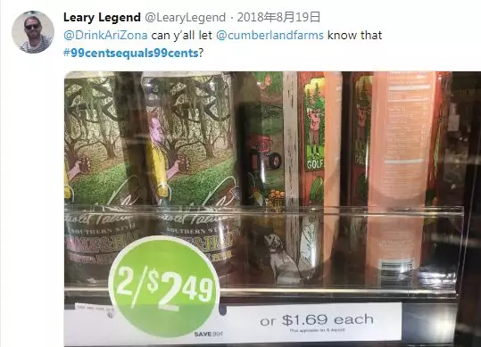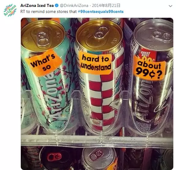 眼看着中间商赚了这么多差价,亚利桑那冰茶自然不会坐视不管,他们发起了 #99cents equals 99cents(99美分等于99美分)活动,走群众路线,号召广大消费者不要为商店里的“高价”买单,积极在线上举报坐地抬价行为: