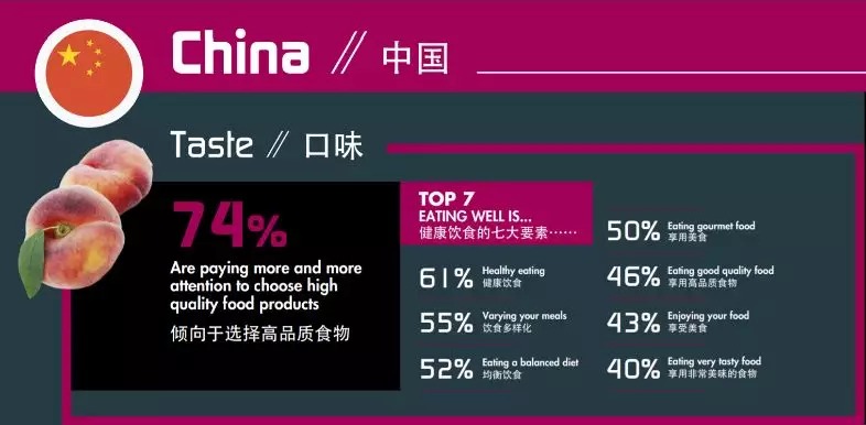 KANTAR TNS调查显示,74%的中国人越来越关注高品质的食物,人们在选择饮食时最首要的三个因素是“健康”、“多样化”、以及“均衡”,健康合理的餐饮习惯正成为中国餐饮的消费趋势。