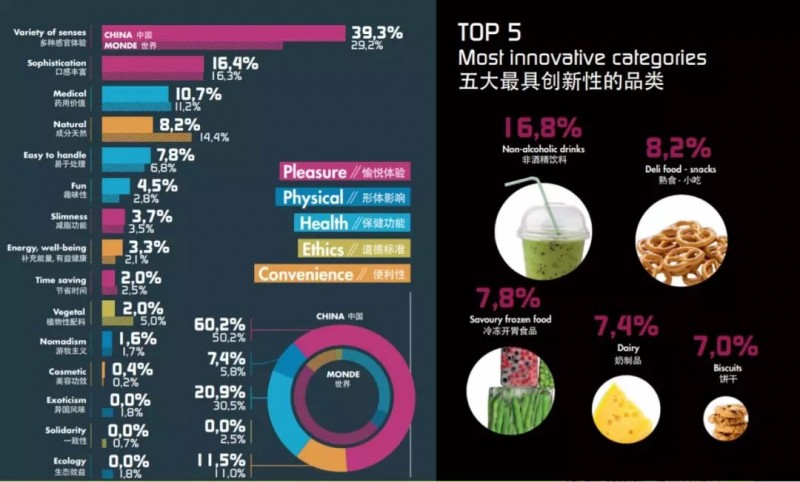 中国的创新产品主要聚焦于能带来愉悦体验的食品,多种感官体验(新的口味和口感)依然是最主要的趋势,占到了所有创新要素的39.3%,高出世界平均10个百分点。此外,对口感丰富的追求也依然势头强劲,占比达到16.4%。“药用价值”和“成分天然”排在创新要素的第三、四位,凸显了中国食品行业在追求愉悦体验的同时,还关照食品的功能性和天然性,例如富含营养物质和纤维素的产品或明显具有医疗性质的创新产品(药用价值)。