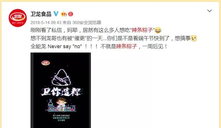 2018年5月端午节前夕,微博大V「全是吃货」告诉卫龙官微想吃「辣条粽子」的心愿,众多网友纷纷支持并呼唤「龙哥」。第二天,卫龙官微回应,「不就是辣条粽子,一周后见!」。