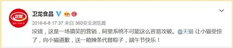 2016年6月,一则卫龙天猫旗舰店被黑的消息刷屏,卫龙门店首页上满屏黑底红字写着「凭什么不给我发货」,恢复正常后不久,再次被「我要给你点颜色看看」等暴走漫画表情包淹没。卫龙官微解释,顾客的收货地址和相关信息有问题,无法发货,导致店铺被黑。
