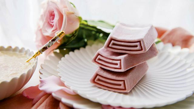 那是一支全身粉色的雪糕。巧克力外皮源自一种产于厄瓜多尔的红宝石可可豆(Ruby Cocoa),非常稀少。粉色的效果既是由于可可豆本身的颜色,也与加工技术有关。钟薛高的创始人林盛告诉本刊,在得知存在这种原料后,就很想把它应用在产品上。但试验了多次搭配,最初和牛奶放在一起竟然有股馊抹布味,直到找到了来自日本的柠檬柚,才调和出上好的口感。两种原料都很难得,不能保证稳定供应,因此只能放在特殊日子来卖。