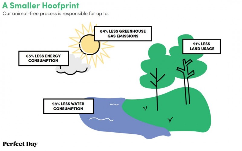 NaturalResources Defense Council的数据显示,生产每千克黄油产生12千克二氧化碳,每千克奶酪产生9.8千克二氧化碳。Perfect Day利用微生物生产酪蛋白和乳清,避免了由于放牧和种植饲料产生的温室气体,生产的乳蛋白更清洁、更环保、比通过工业化畜牧业生产更友好。