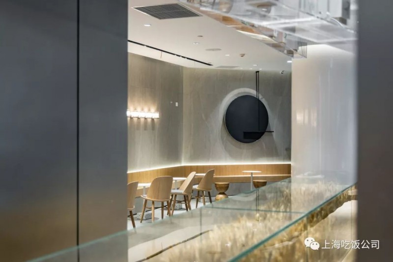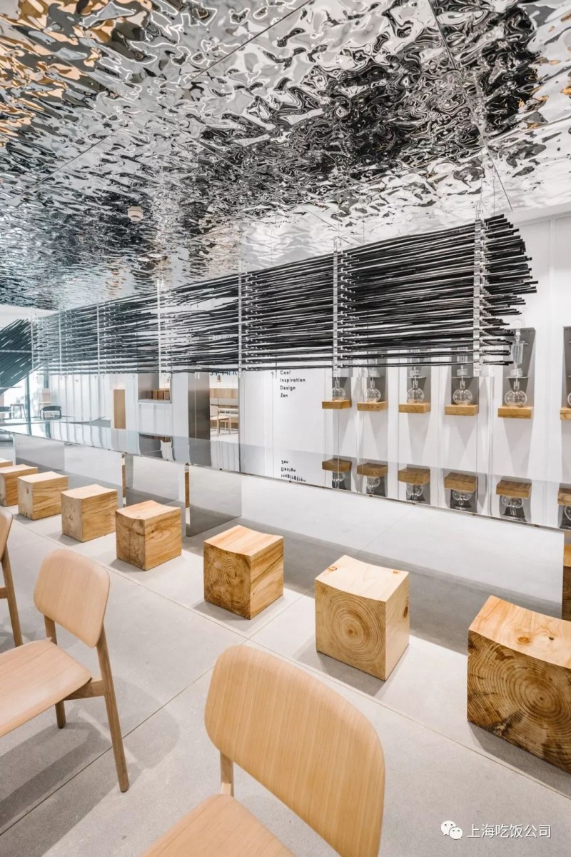 坐在店里有种古时候文人墨客坐在一起参加雅集之感,大气而端庄,设计感十足,这家店面积很大,搭配反光镜面,更显得空间在无限的延伸。
