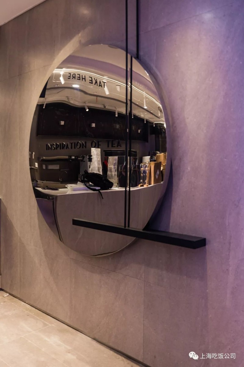 墙上的茶品展示用的是香槟金的金属玉圆盘,为整个空间提亮了颜色,干净又摩登的感觉。