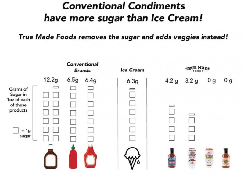 位于弗吉尼亚州亚历山大市的True Made Foods公司生产无糖/少糖的番茄酱、樱桃酱和烧烤酱,使用天然蔬菜如胡萝卜和南瓜使产品增加甜度。创始人Abe是一名崇尚健康饮食的食客,也是四个孩子的父亲。他认为传统番茄酱就像直接把糖放在食物上一样,传统番茄酱中的糖含量比冰淇淋还多,所以他试图限制孩子们食用番茄酱,却以失败告终。