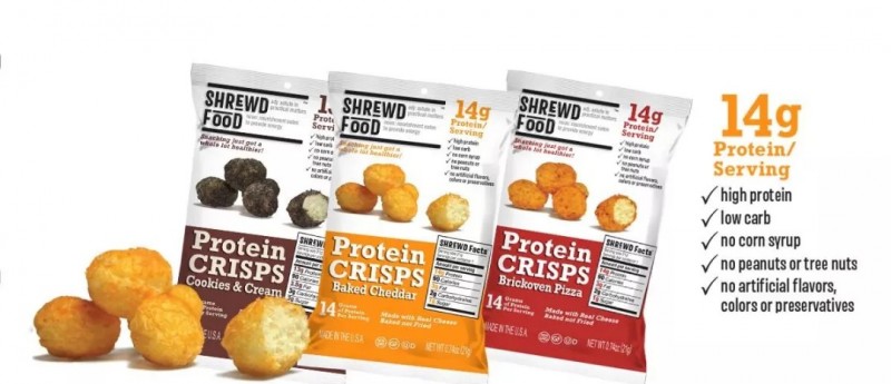 ShrewdFood公司推出的Protein CRISPS蛋白脆使用牛乳分离蛋白为原料,每份含有14克蛋白质,还有辣酱切达干酪和奶油饼干多种风味。