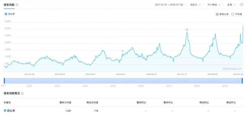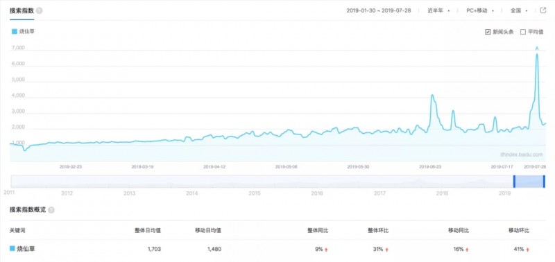 看第一张图,2019年2月~7月底,“烧仙草”三个字的搜索指数不断走高,6、7月份还迎来两个小高峰。