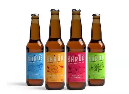 在包装上,该饮料使用长颈12盎司琥珀色玻璃瓶装,符合CSD(联合国可持续发展委员会)工艺,标签设计如同一瓶精致的啤酒,感觉就像一个手工制品。其中品牌名称“Small Barrel”的文字比“Shrub”字样小得多,消费者可以直接看到产品名称。